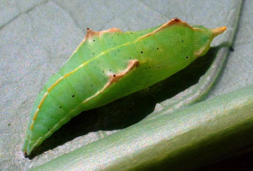 After around 7 days, the eggs will hatch and from each egg emerges a hungry little caterpillar. These caterpillars quickly get to work munching on leaves, and in their path of destruction they leave behind holes that look like shot-holes, or damage from small hail stones.